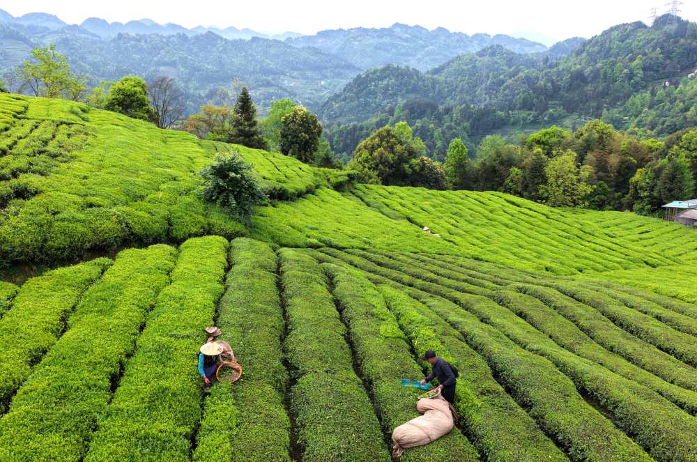 ↑ 4月19日,茶农在湖北省秭归县茅坪镇松树坳村一生态茶园采收雨前茶(无人机照片)。新华社发(王罡摄)