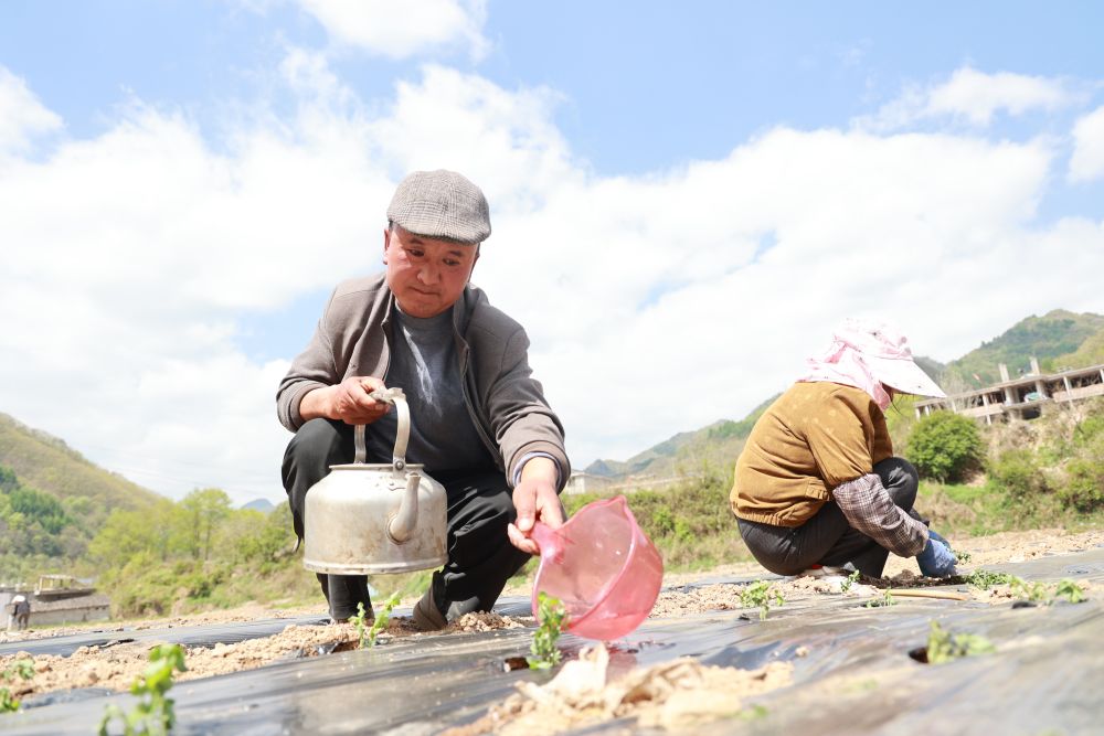 ↑ 4月18日,在甘肃省陇南市康县豆坝镇豆坝村,农民栽种中药材贯叶连翘。新华社发(黄培军摄)
