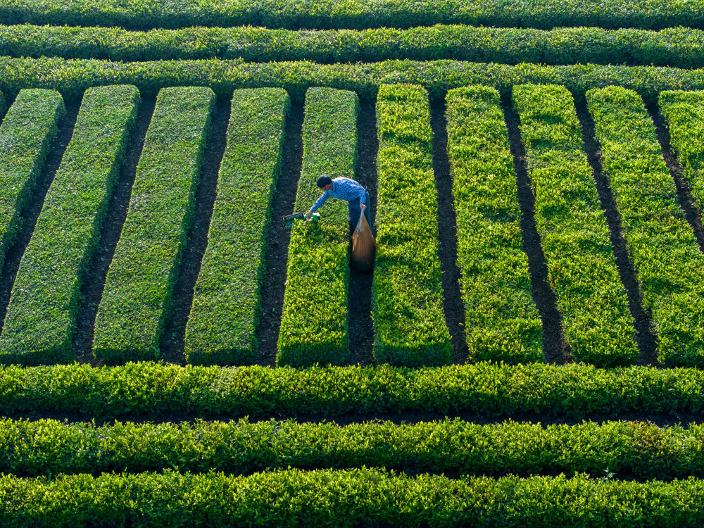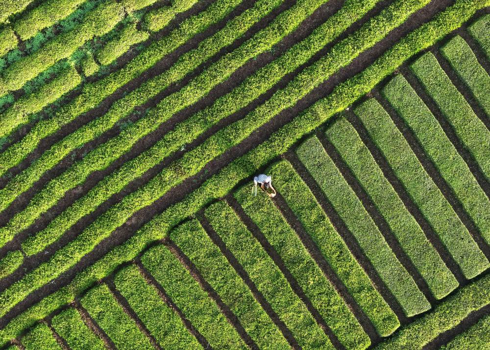 ↑ 4月18日,在湖南省衡山县开云镇,当地村民在茶场采摘春茶(无人机照片)。新华社发(曹正平摄)