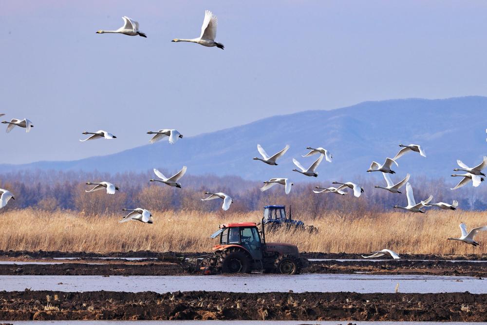 ↑ 4月18日,在黑龙江省同江市的一处水田里,正在作业的农机和起飞的天鹅同框。新华社发(刘万平摄)