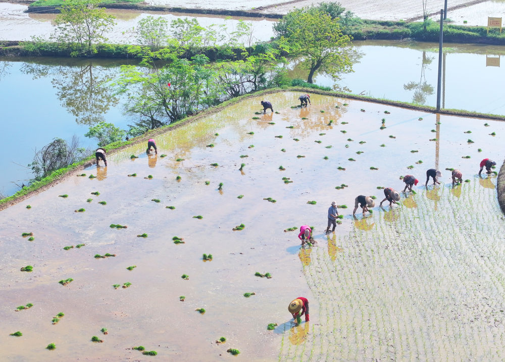 ↑ 4月19日,湖南省衡阳市祁东县金桥镇农民在进行早稻插秧作业(无人机照片)。新华社发(曹正平摄)