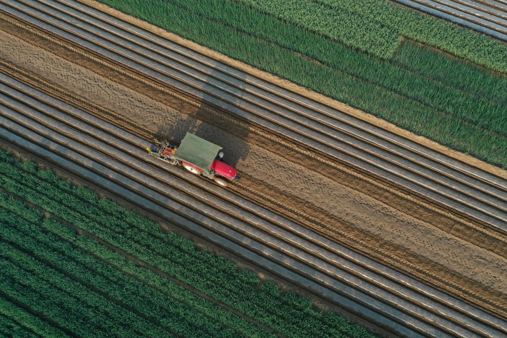↑ 4月19日,在河北省唐山市丰润区银城铺镇大八里村,农民驾驶农机翻耕土地(无人机照片)。新华社发(朱大勇摄)