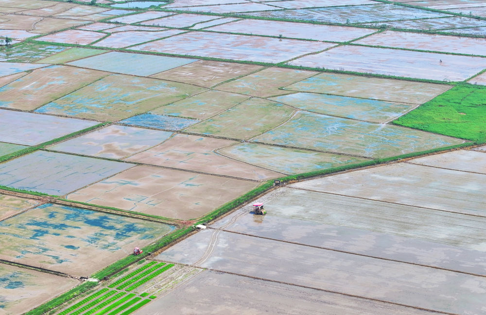 ↑ 4月18日,湖南省衡阳市衡山县白果镇农民驾驶农机在进行早稻插秧作业(无人机照片)。新华社发(曹正平摄)