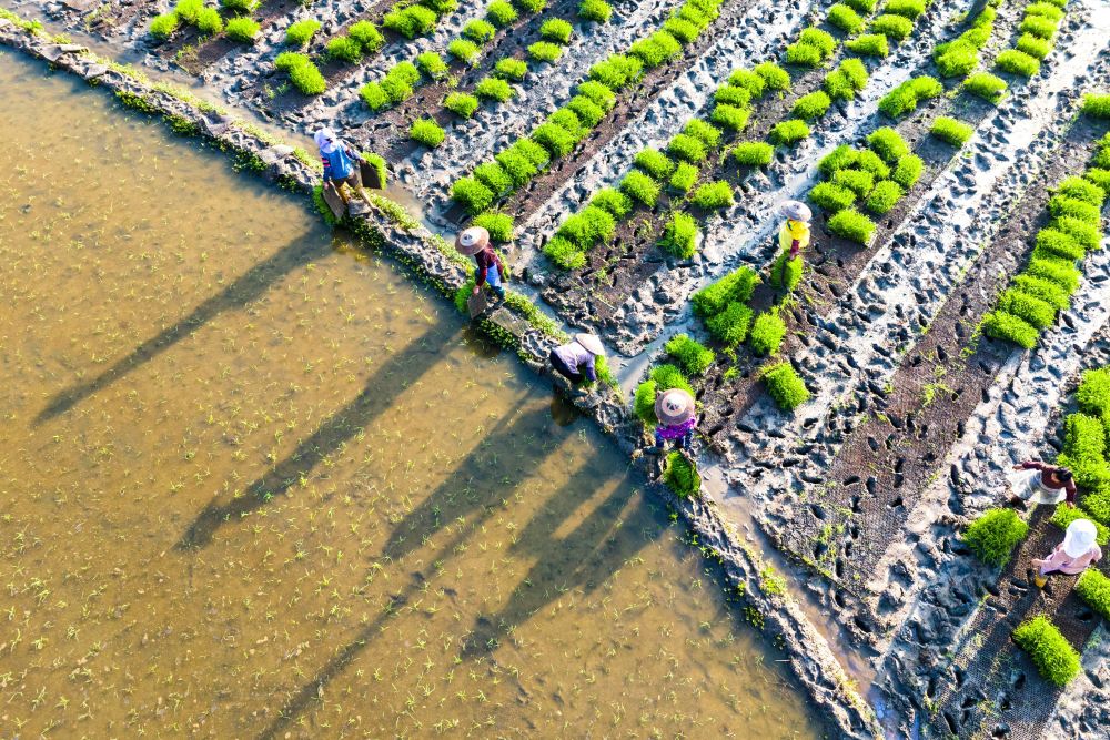 ↑ 4月19日,湖南省衡阳市祁东县金桥镇农民在起秧苗(无人机照片)。新华社发(曹正平摄)