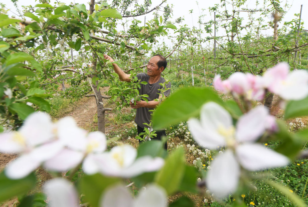 ↑ 4月19日,在河北省石家庄新乐市邯邰镇大流村,果农为苹果树疏花。新华社发(贾敏杰摄)