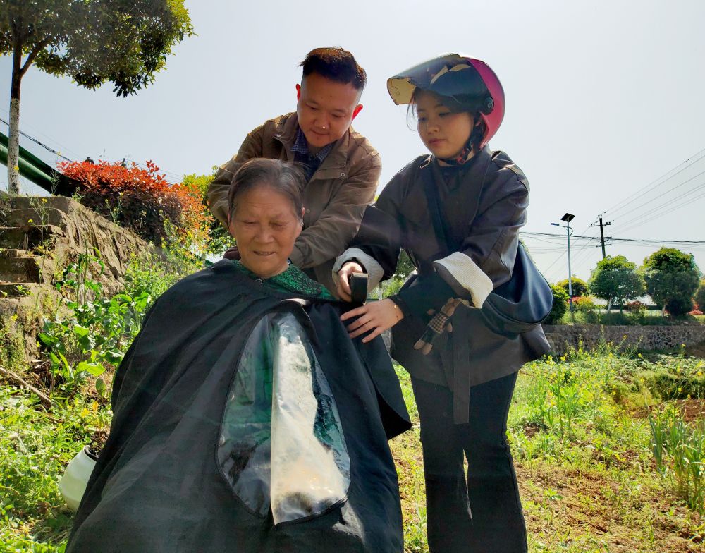 任鹏和妻子余丹正在田间给陈玉珍理发。新华社记者 孙正好 摄