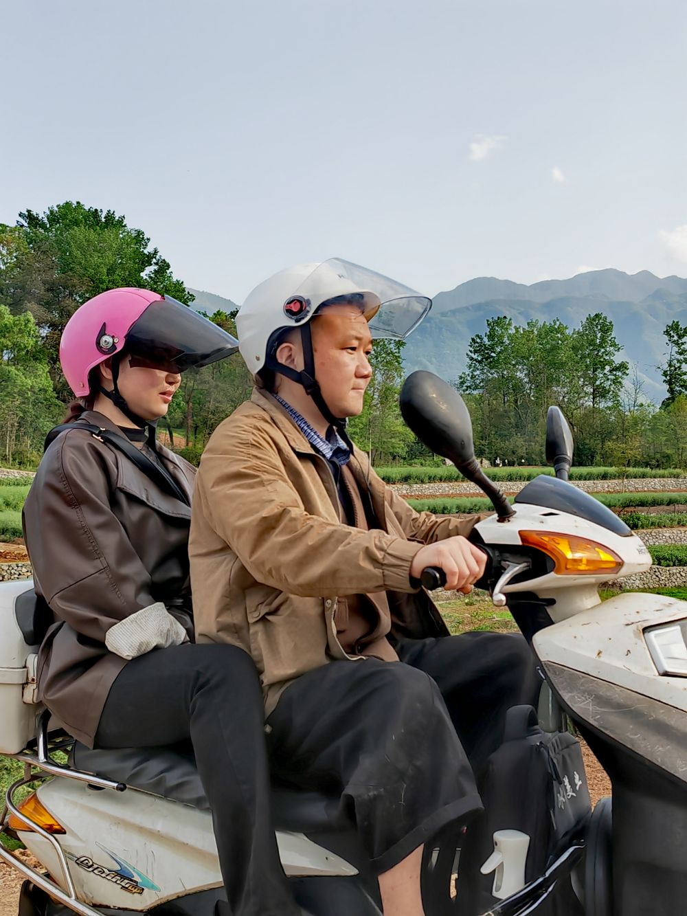 任鹏和妻子余丹骑着摩托车行驶在乡间。新华社记者 孙正好 摄