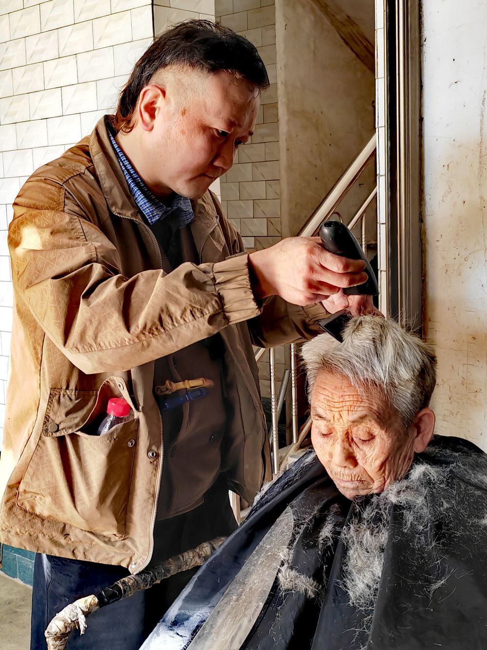 邻居爷爷曾拄拐走一个多小时山路去集市理发——2025年5月探亲见此,任鹏触动了:“既然我有这个手艺,何不顺手帮个忙?”此后,他和妻子余丹每周腾出一两天,把理发店从县城搬到乡间。