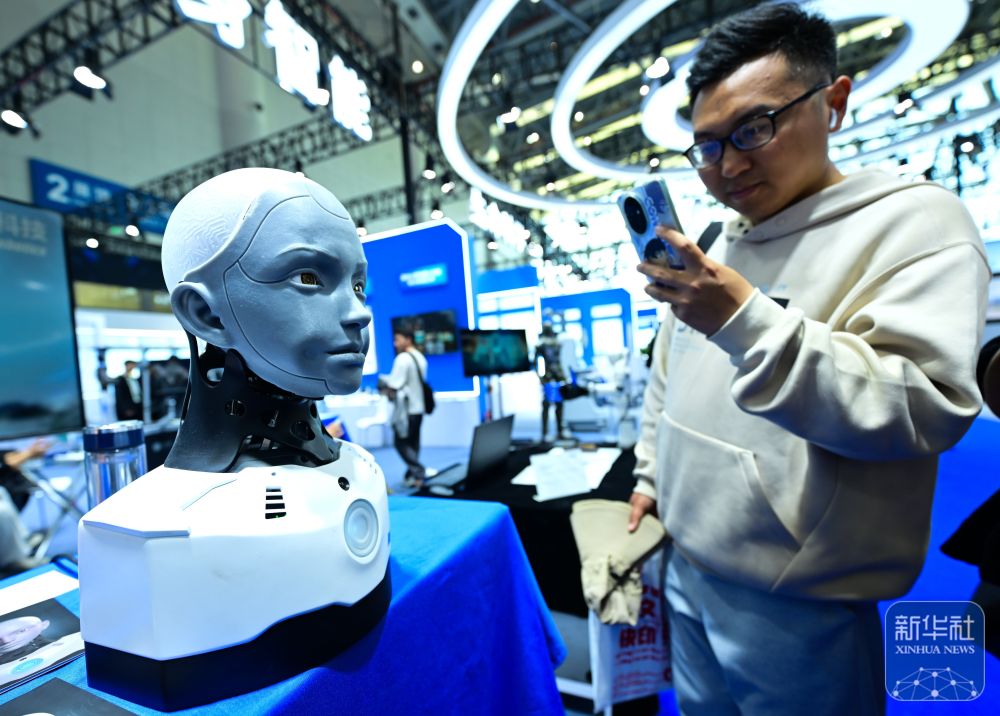 ↑ 4月26日,观众在第四届中国(安徽)科技创新成果转化交易会上和一款人形机器人互动。新华社记者 周牧 摄