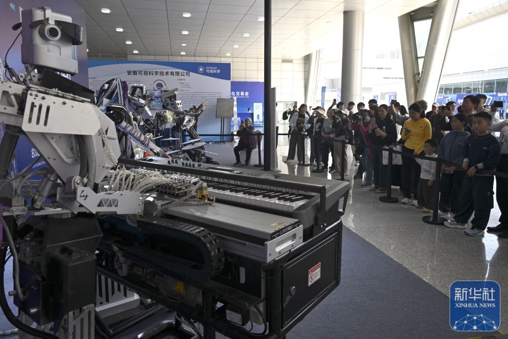 ↑ 4月26日,观众在第四届中国(安徽)科技创新成果转化交易会上观看机器人乐队演出。新华社记者 黄博涵 摄