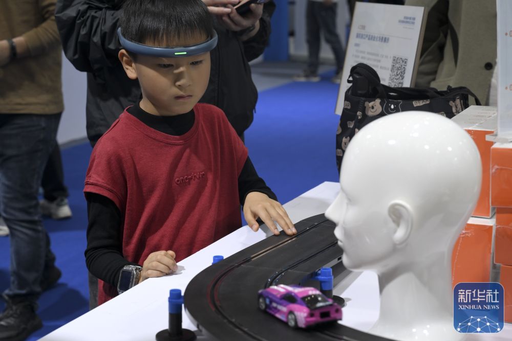↑ 4月26日,小朋友在第四届中国(安徽)科技创新成果转化交易会上体验一款脑控赛车。新华社记者 黄博涵 摄
