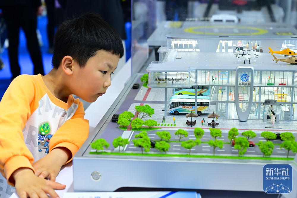 ↑ 4月26日,小朋友在第四届中国(安徽)科技创新成果转化交易会上观看一款低空枢纽起降场模型。新华社记者 周牧 摄
