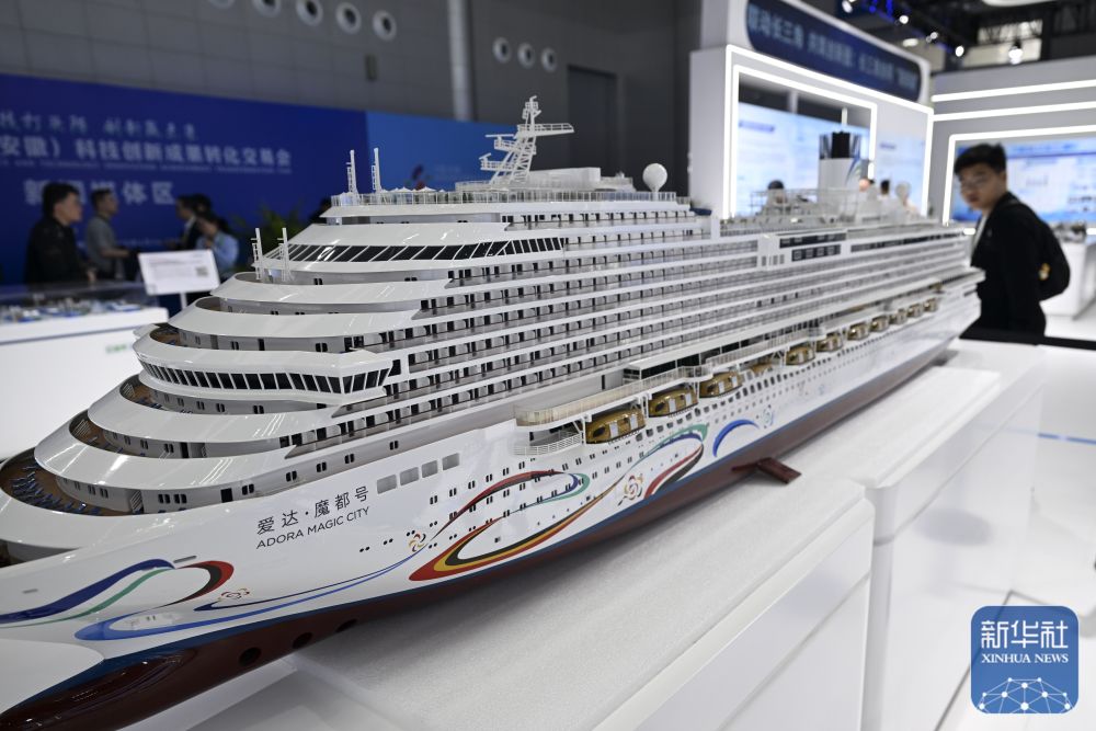 ↑ 4月26日,观众在第四届中国(安徽)科技创新成果转化交易会上观看“爱达·魔都号”邮轮模型。新华社记者 黄博涵 摄