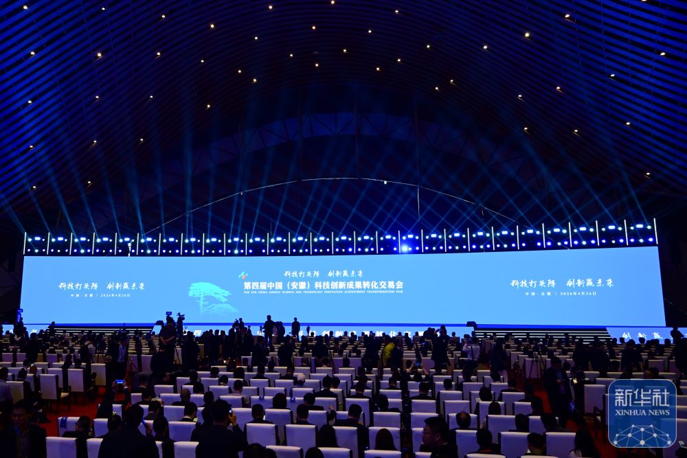 ↑ 4月26日拍摄的第四届中国(安徽)科技创新成果转化交易会开幕式现场。新华社记者 周牧 摄