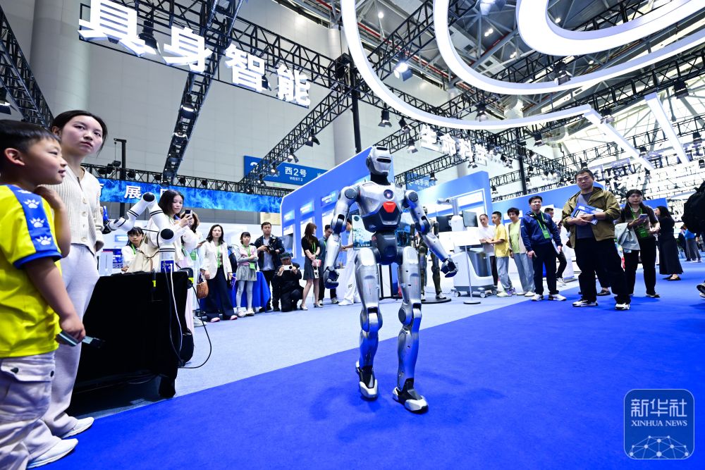 ↑ 4月26日,观众在第四届中国(安徽)科技创新成果转化交易会上观看一款人形机器人。新华社记者 周牧 摄